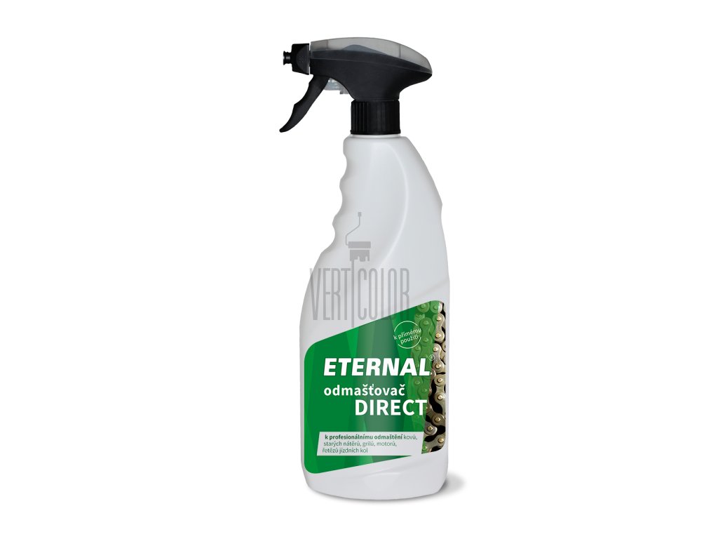 ETERNAL odmašťovač DIRECT je určen k čištění a odmašťování kovových povrchů, podlah, starých nátěrů a jiných podkladů před nátěry vodou ředitelnými i rozpouštědlovými nátěrovými hmotami. Je vhodný pro čištění motorů, odmašťování v opravárenství, galvanovnách, lakovnách, průmyslových provozech, průmyslové čištění skla, čištění grilů, krbů, řetězů a převodů jízdních kol, kuchyňských odsavačů. Je určen k přímé aplikaci. Odmašťování lze provádět ručně, postřikem. Součástí obalu je rozprašovač se speciální mřížkou, díky které je významně snadnější odmašťování svislých ploch.